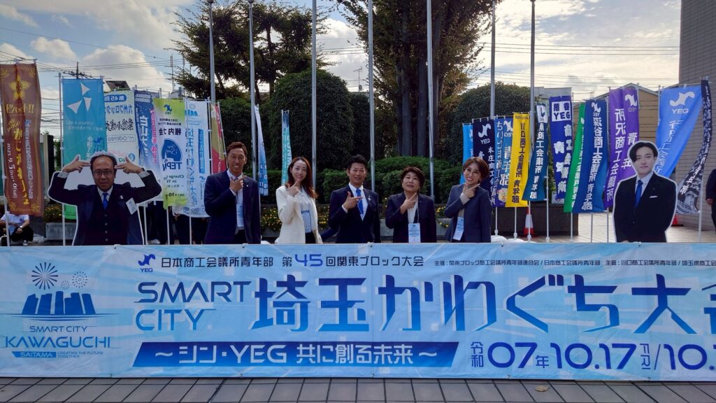 日本YEG小野会長、関東ブロックYEG清水直前会長、埼玉県連YEG田部井会長、関東ブロックの仲間と佐野メンバーで記念撮影も叶い、拡がりを感じているメンバーの顔が、とても嬉しかったです。